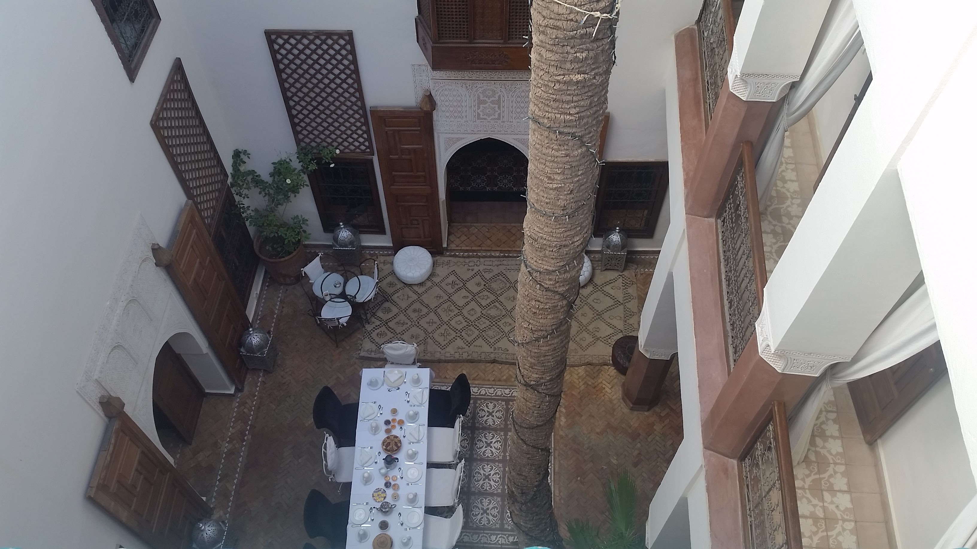 Faiza, Ashley, and I roomed together along with Sam who joined us later. After we were settled, we all found our way to the rooftop to do our first yoga practice with Kevin Lamb. And what a practice! It was one of the most intense two-hour practices I had done and included a one-legged side plank that turned into the front splits. I’m still working on that one. After the practice we freshened up for dinner and all sat at a long table draped in a white cloth under the palm tree and night sky. We were about to experience our first round of Moroccan tajine, a style of slow cooking in a clay dish with a conical lid. We had aubergine (eggplant) salad and bread, tajine with chicken and vegetables and rice. I know we had dessert at the end but I cannot remember. I was so full of delicious food. I went to bed satisfied and wondering what the next day would hold.