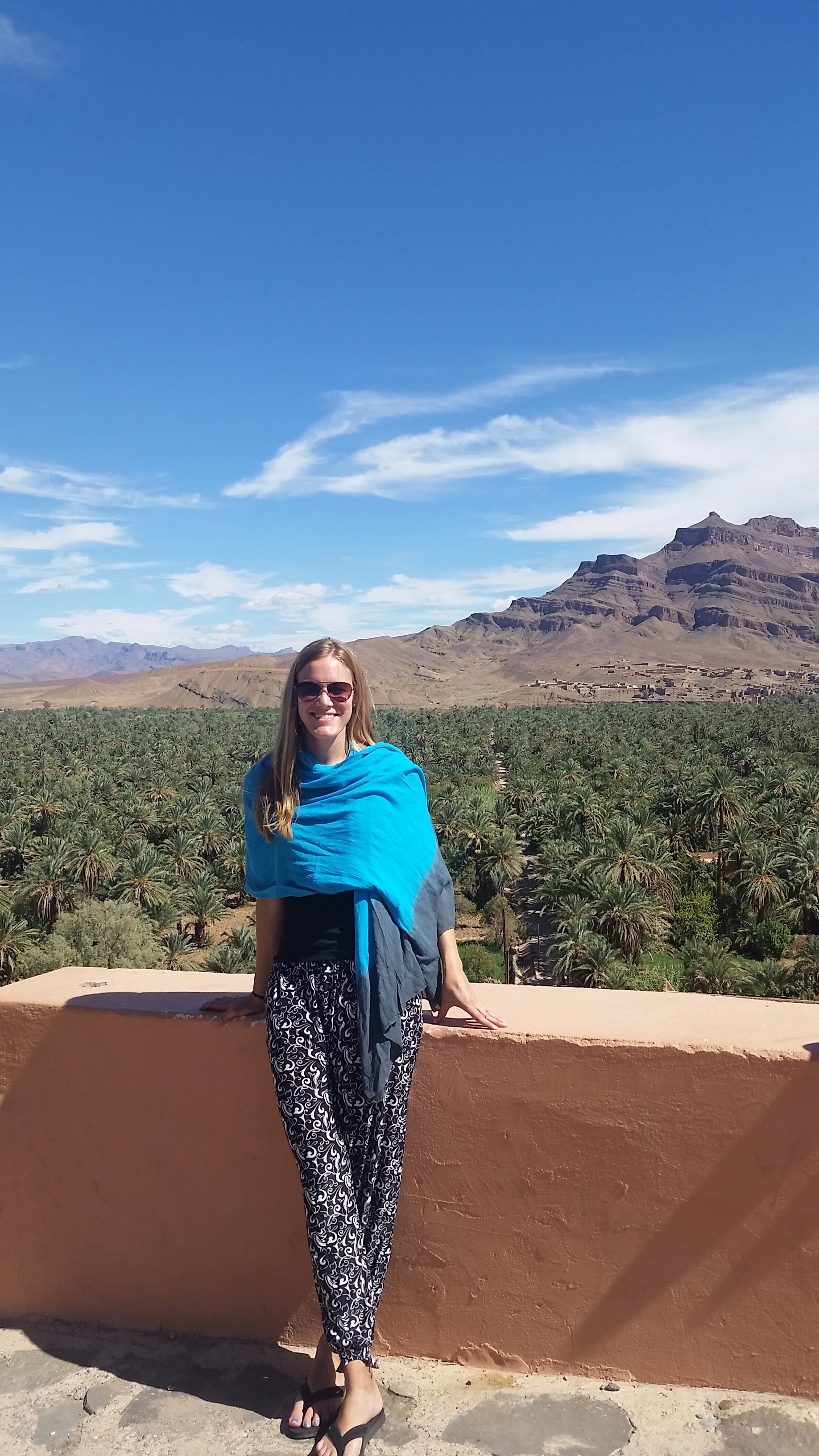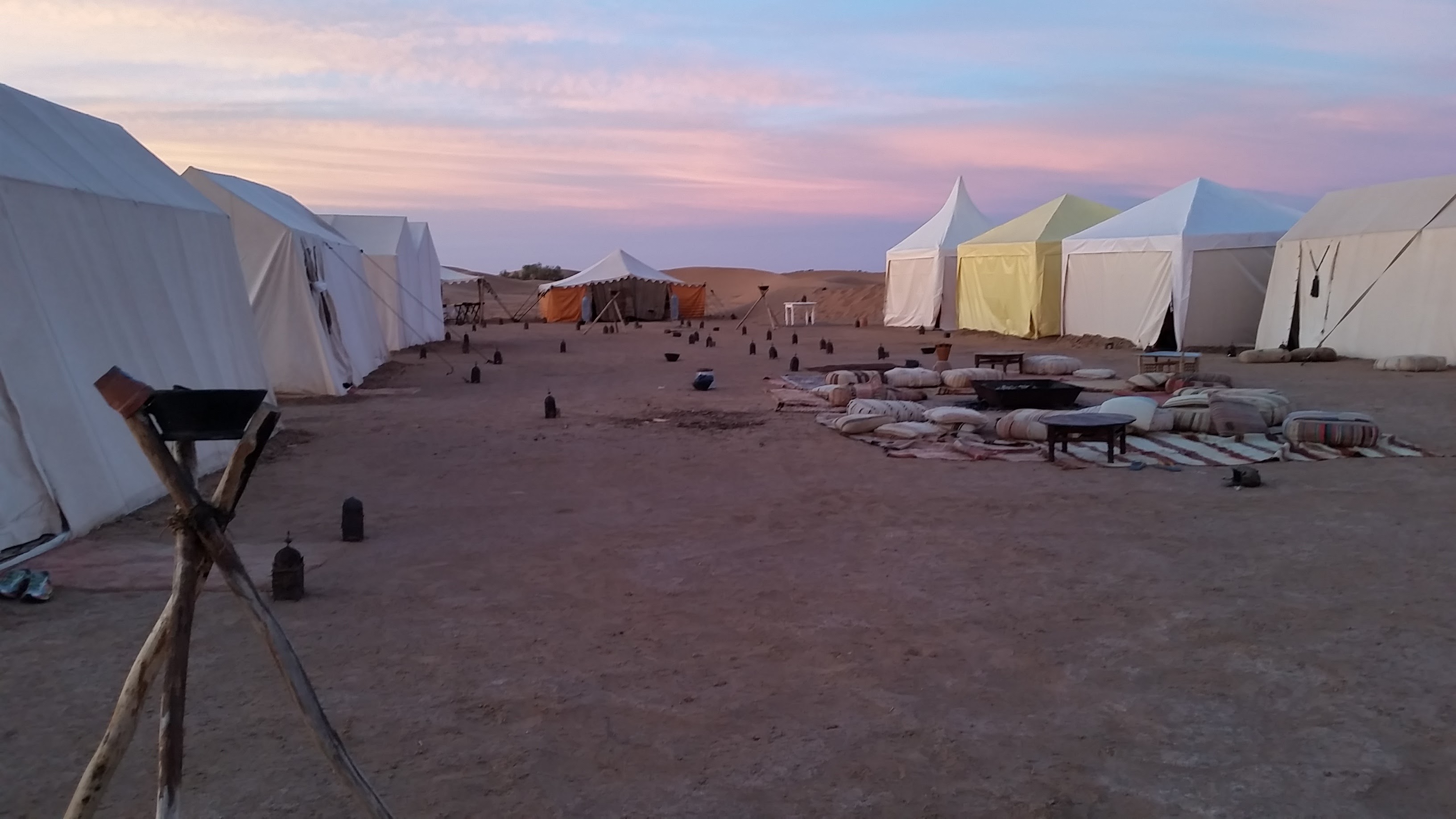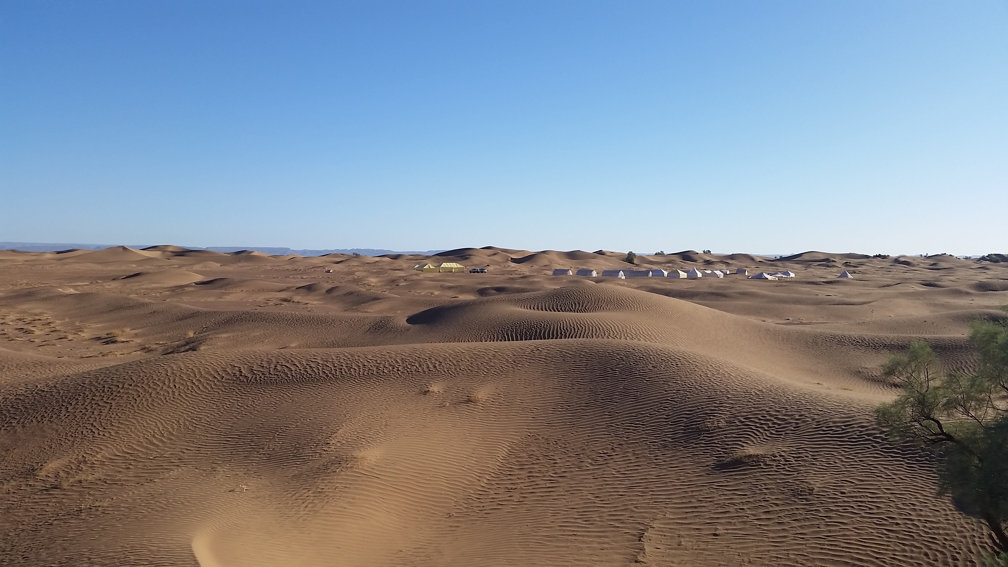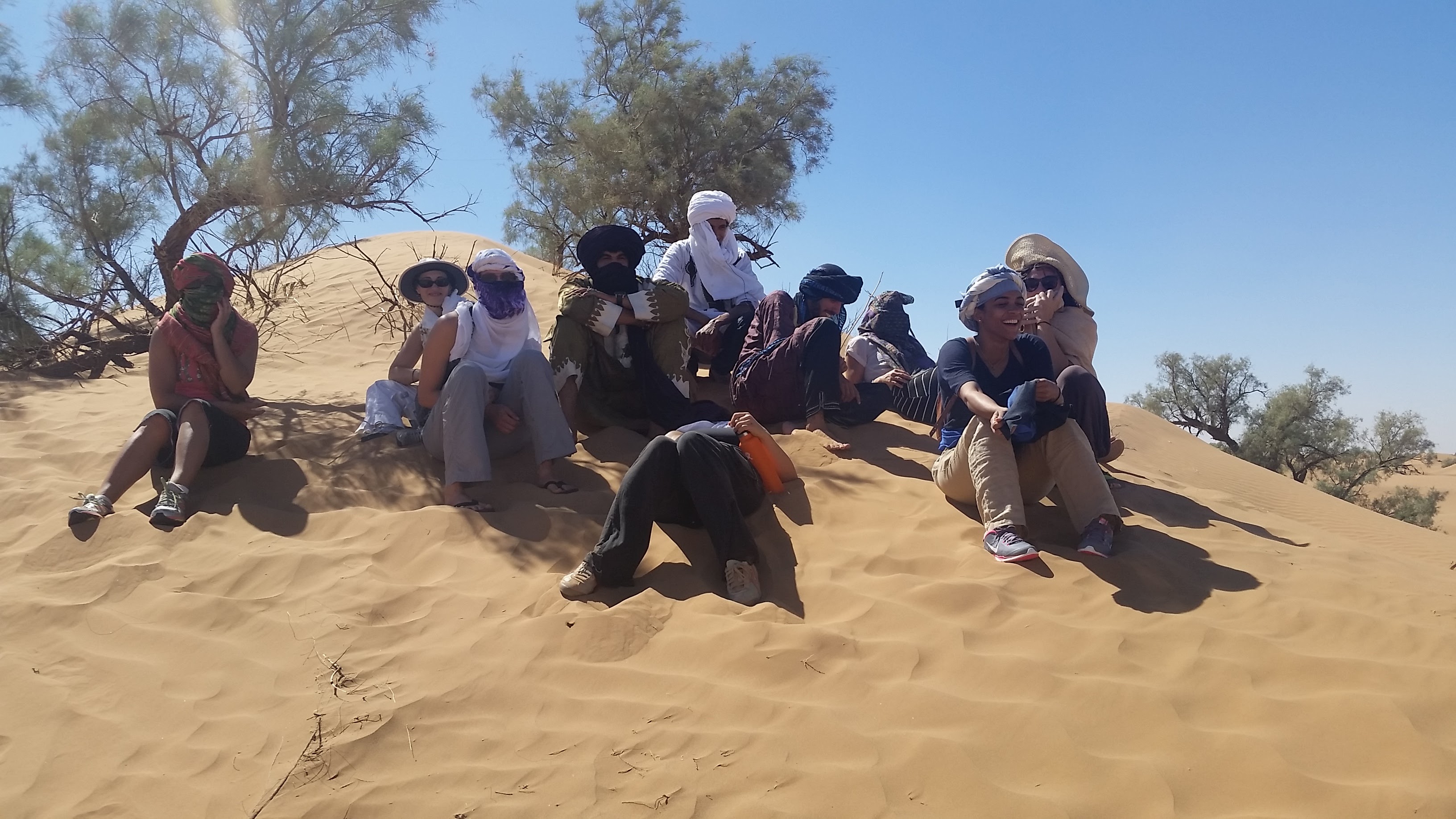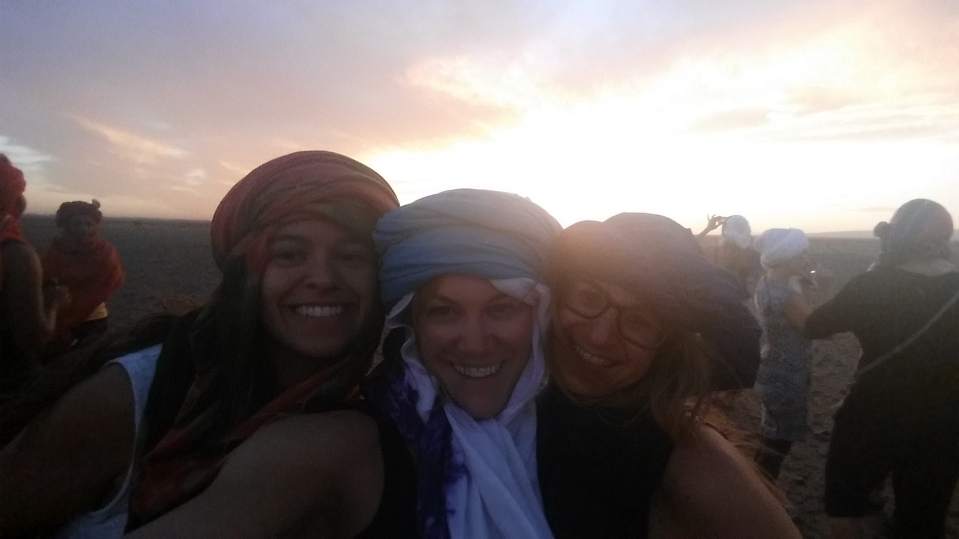 Once the sun came up, the flies came out. They didn’t bite, but they did swarm. Each person had their own fleet of 50 flies at all times. We did yoga shrouded in our turbine scarves, trying to keep the flies from crawling on us. Once the coolness of the morning evaporated, the heat set in. Because the tents had no ventilation, taking an afternoon nap inside felt like trying to sleep in a sauna. We sought refuge under the shade of the open-air dining tent and played Farkle (an amazingly fun dice game that Danielle, our NYC bar owner friend, taught us) while drinking water, sometimes with ice. Then the sun set, and the flies went to sleep, and the Sahara nights charmed us into forgetting the days by offering uninhibited views of the galaxies and sweet, cool breezes. We ate lavishly and drank wine with dinner. Then everyone sat around or danced by the fire as the locals played drums and sang. I drummed with them a couple times and thoroughly enjoyed the experience. The Sahara left many memories: the camel ride that was supposed to be at noon ended up happening at sunset because of a sick camel (thanks camel!), the walk around the dunes with the locals telling us about their lives, my solo walk along the ridges to take it all in. It was truly like no other place I have ever been.