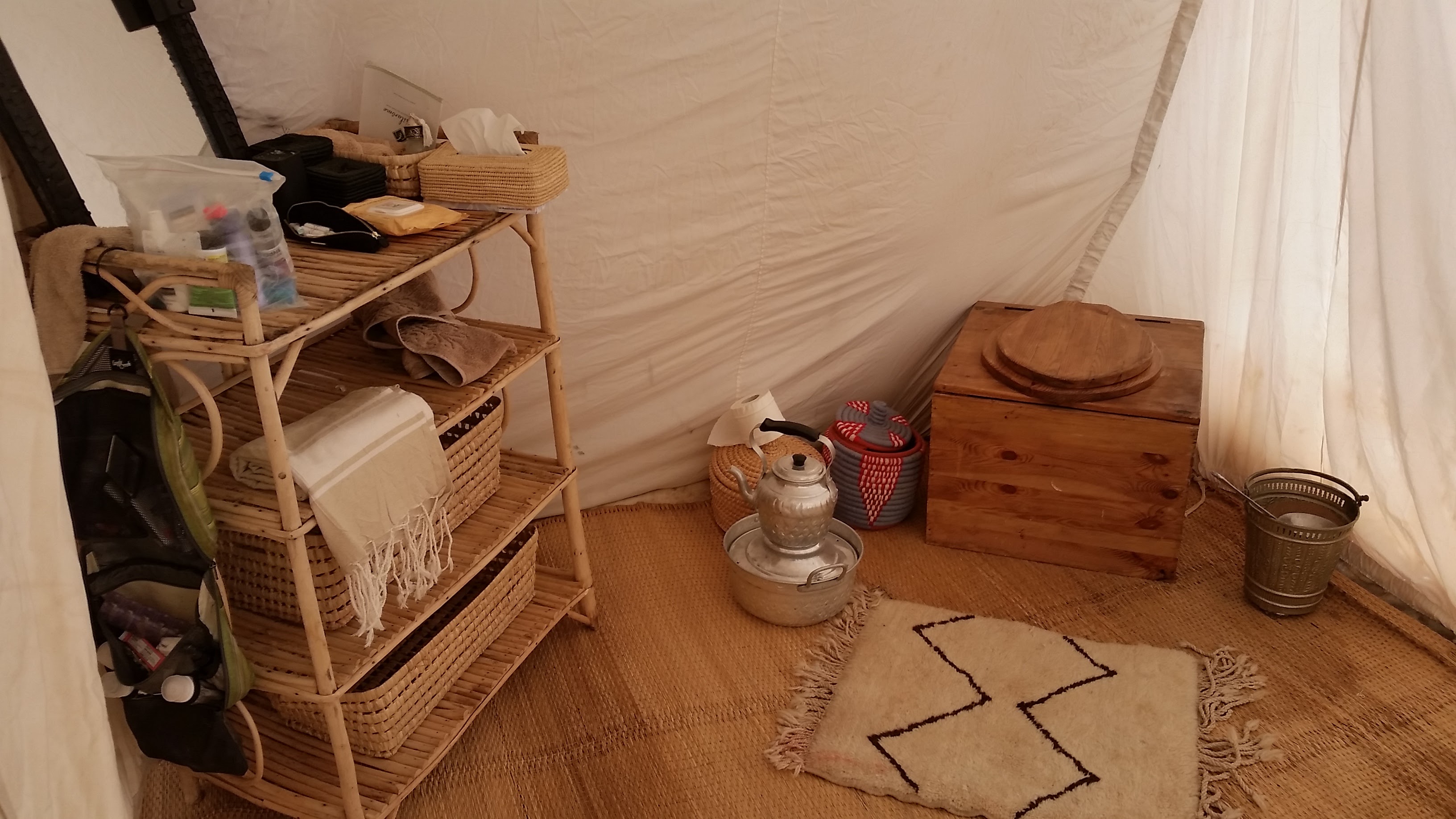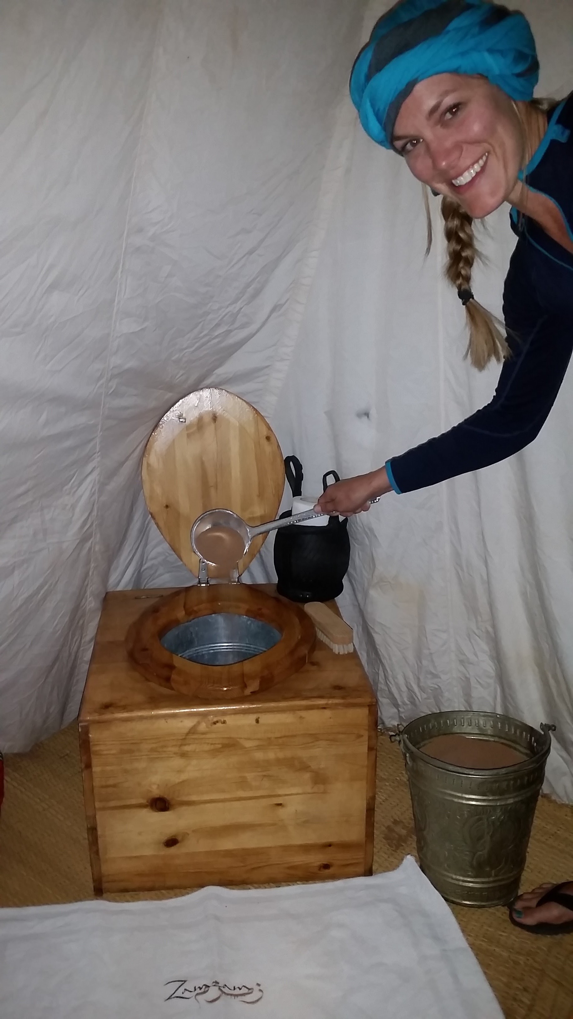 We arrived to find large white tents in two rows with covered candles lighting the way to the resting and dining tents. Each tent was divided into two sections on the inside: two beds in one area and a bucket of water, shelf with mirror, and bucket with a toilet seat in the other. We learned that we would be “flushing” the toilet by putting a scoop of sand in the bucket when we finished. That night, I stepped on the rug in front of our toilet and found it sopping wet and the bucket surprisingly empty. We got a new bucket the next day. You can’t expect perfection when glamping in the desert.
