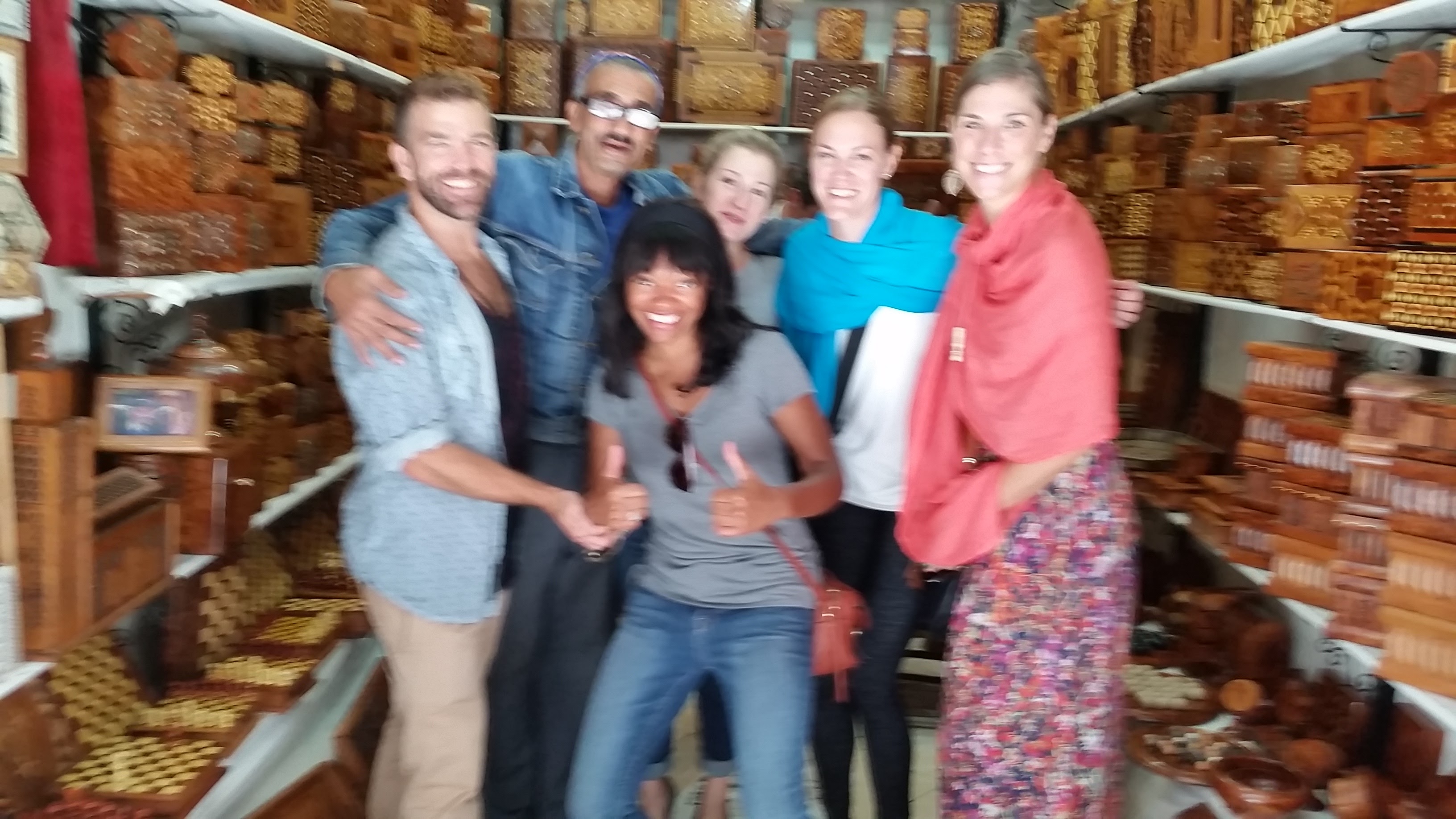 I awoke the next morning at the 5am call to prayer. The calls are five times a day over loud speakers all across the city. I tried to go back to sleep but just laid in bed until we started our vigorous yoga practice. Breakfast couldn’t come quickly enough for me. I was so hungry that I devoured the fruit, pancakes, omelets, and bread with various jellies, butter, and honey. Moroccan mint tea is served at almost every meal and throughout the day, and I enjoyed the calming effect it had on my stomach after eating so much. My next mission was to prepare for a tour of the town and a bit of shopping in the souks (markets). Brahim, our guide, met us and led us through the crazy maze of the walled streets through the courtyard of a mosque, past a fountain, and to an apothecary. We smelled and tried all sorts of different concoctions, but the one I purchased was black cumin. We wrapped a small amount in a thin cloth, crushed it by rolling it in our hands, and then smelled it. The effect was close to eating a large ball a wasabi – incredibly opening in the sinuses. After spending a significant amount of time and money in Herboriste Du Paradis, we left to get lost deep in the markets of Morocco amidst the colors, confusion, crafts, and chaos. “Where you from? Oh, good place. Look in my store. You like? I give you Morocco price.” I think every salesperson said this to us as we walked through the tight corridors made of small stalls filled with leather shoes, wooden boxes, brass lamps, hamam towels, and leather bags. Turns into turns into dead ends and back and suddenly we were in an open courtyard with snake charmers, monkey owners, food stands, goods stands, and restaurants. We met up with another part of our group that had gone shopping at a warehouse and then walked back to Zam Zam for yoga and dinner.