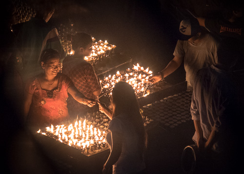 Joel and Tenzing took us to the Kathmandu Guest House to drop our bags, and then we ventured into the city for our first taste of Kathmandu chaos in Thamel. Tight streets, traffic, people, shops with wares hanging and setting outside, motorbikes, bicycles, lights, signs, smells, and sounds. The activity seemed ceaseless. We got a few groceries and went back to the hotel. Then, I crashed into a jet-lag induced sleep. The next morning we started our photography workshop over breakfast – learning about aperture priority, ISO, and shutter speed. We gathered our cameras and in the next two days went to several temples: The Golden Temple of Patan, Swayambhu Monkey Temple, Pashupatinath, and Boudanath. As we learned to make adjustments to our cameras for better pictures, we also learned about the culture of the area. The earthquake damage to some of the older buildings still remained in devastated crumbles. Sadhus, holy men, live in some of the damaged temples. Many are yogis that have removed themselves from normal society to pursue the highest form of liberation from the material world. They have a distinct dress with long dreadlocks and do not work. So, they get food from donations. People also donate money to the living goddesses, kumaris, who live at the temples. These living goddesses are young girls chosen to be goddesses based on very strict qualifications and their horoscope. Giving blessings and healing sickness, they are believed to be the embodiment of a female deity. They are only allowed to go outside for certain festivals, their feet cannot touch the ground, and they are tutored to receive their education. Hindus and Buddhists both believe that when the girls begin menstruating, the deity leaves their body. Their time as living goddess then ends, and they return to regular society. The society as a whole is an interesting mix of the Buddhist and Hindu religions. The cultures collide in a mixture of tradition with spinning prayer wheels, lighted prayer candles, and prayer flags all over the country. We captured and experienced a few of these unique scenes within the city of Kathmandu. It is a place I will never forget.