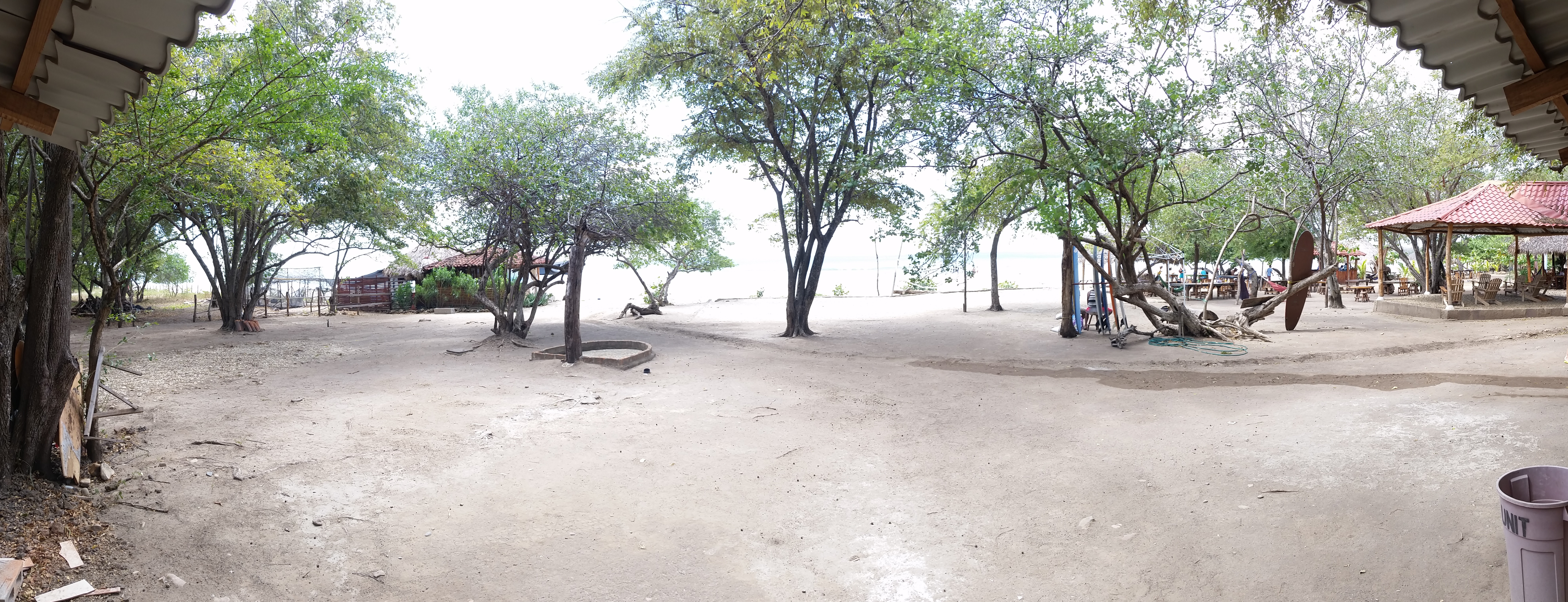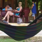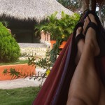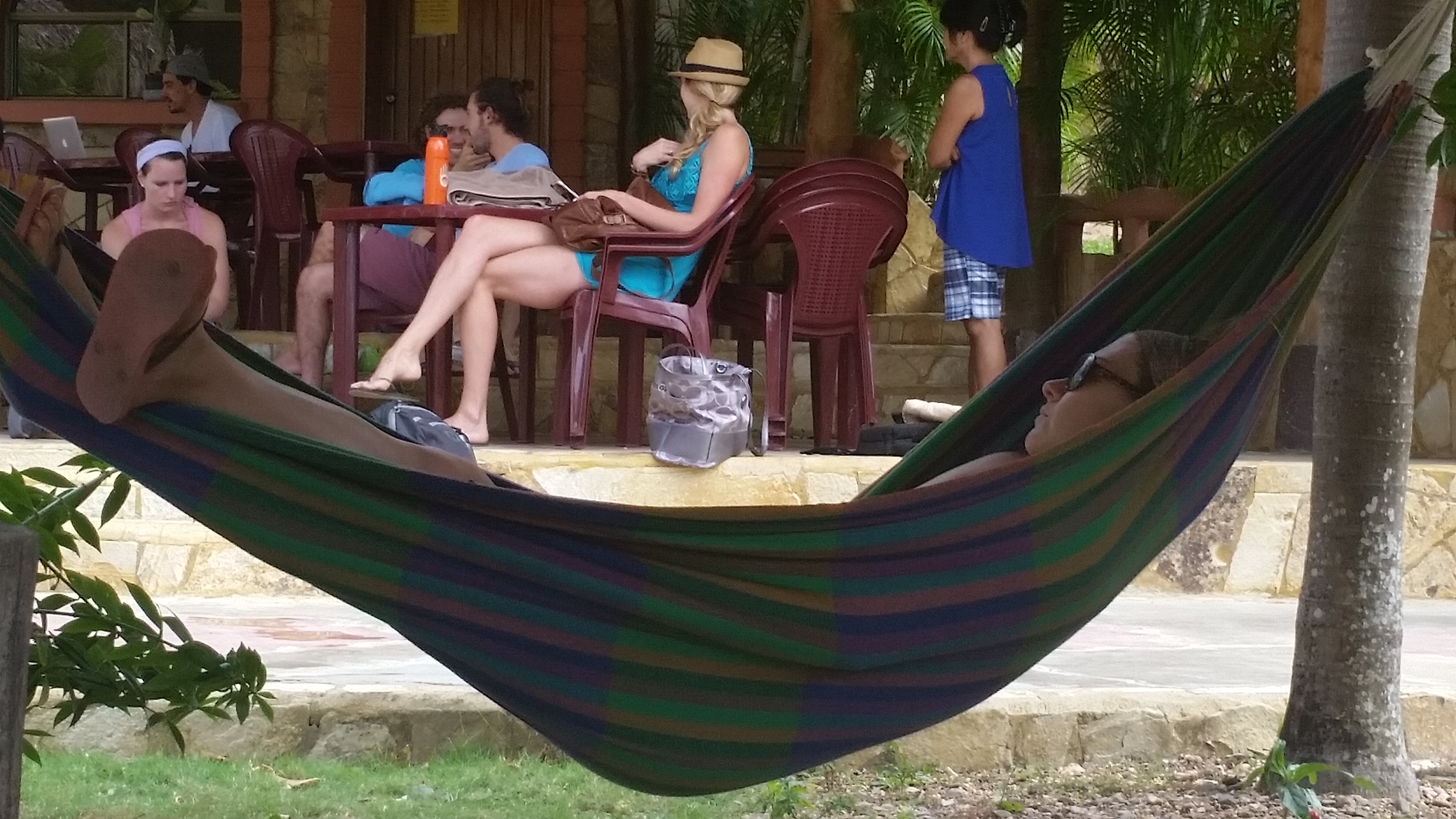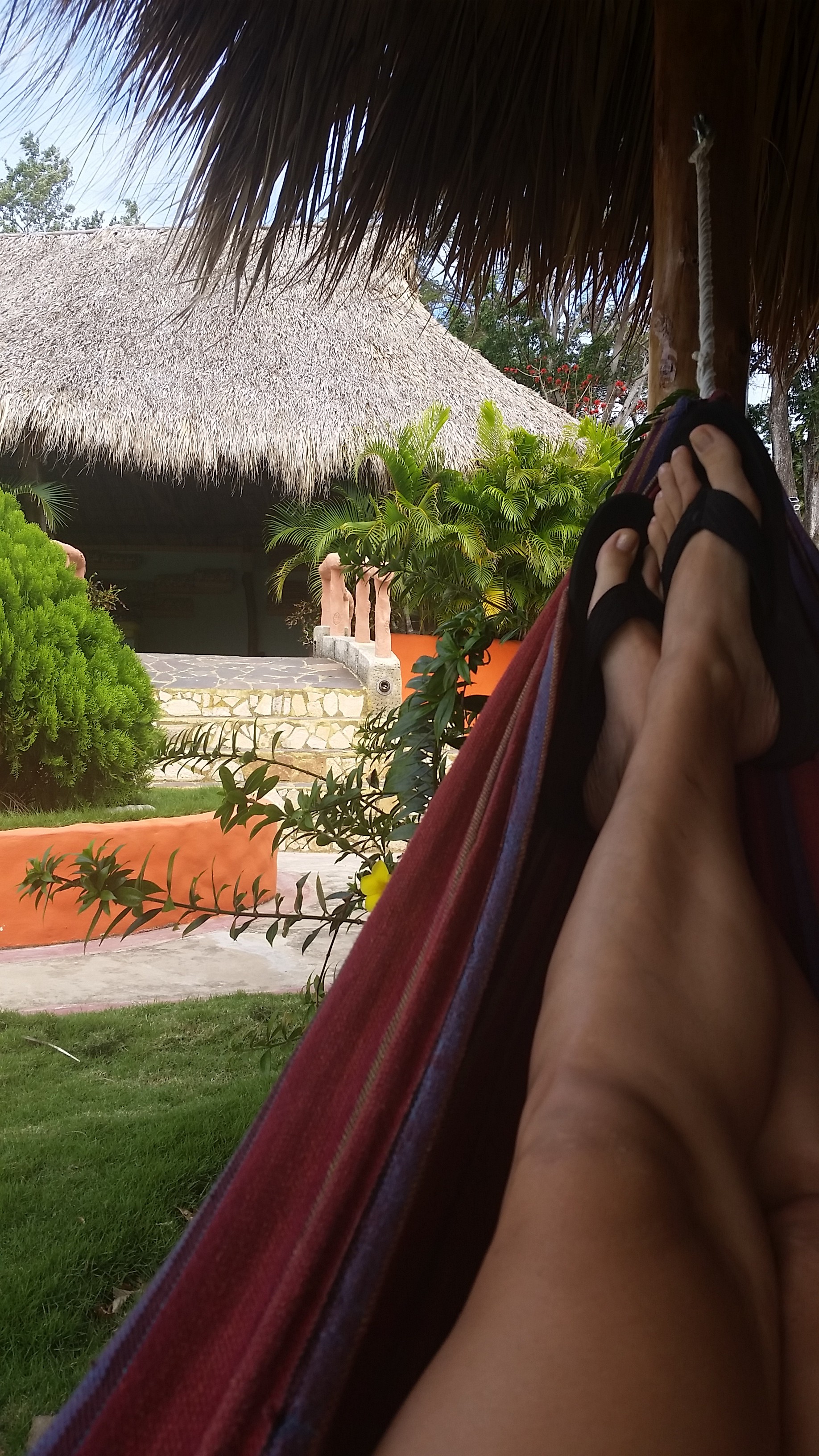 Sitting on this porch, I look out and see palm trees laden with coconuts, hibiscus bushes full of red flowers, and the grass of a green yard fading slowly down a hill to a small gathering of water resting a hundred yards from the ocean from which it came. From that point forward lies a wide beach full of sand: loose, deep, tan sand; then packed, wet sand that allows your feet to sink an inch or two; then wet, darker-colored sand that holds firmly; and finally sand that has been licked, lingered, and left by the waves. The waves break suddenly against the shallow shore creating a white marble affect in lines and swirls across the water. Above the water, cranes, pelicans, and sea birds of all types soar across the sky while a light breeze keeps me cool in this humid but rich place.