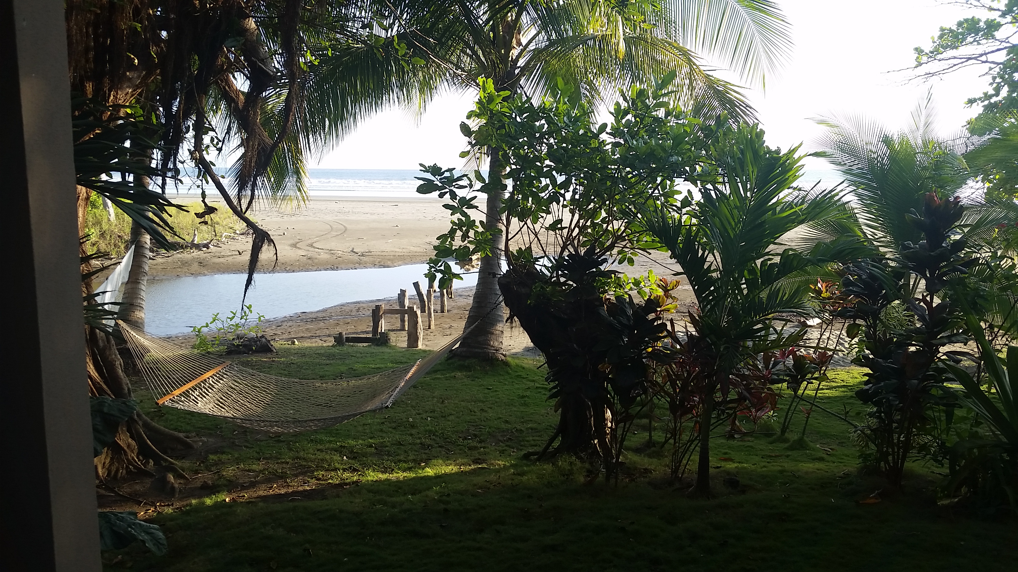 Sitting on this porch, I look out and see palm trees laden with coconuts, hibiscus bushes full of red flowers, and the grass of a green yard fading slowly down a hill to a small gathering of water resting a hundred yards from the ocean from which it came. From that point forward lies a wide beach full of sand: loose, deep, tan sand; then packed, wet sand that allows your feet to sink an inch or two; then wet, darker-colored sand that holds firmly; and finally sand that has been licked, lingered, and left by the waves. The waves break suddenly against the shallow shore creating a white marble affect in lines and swirls across the water. Above the water, cranes, pelicans, and sea birds of all types soar across the sky while a light breeze keeps me cool in this humid but rich place.