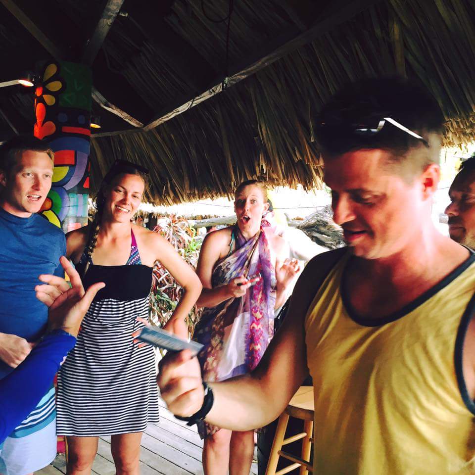 Our main vacation rental (Villa Tropical) had beds for twelve, a full kitchen, ping pong, darts, corn hole, pool, games, a hot tub, sand volleyball court, and a swimming pool with a waterfall. We played sand volleyball the first night, four-on-four, and realized that we were in a danger zone. Someone must have hauled in the sand directly from the beach – broken shells and all – leaving us with bleeding cuts and scratches. We kept playing. Then, if the ball went out of bounds, the goat heads (the meanest stickers your foot has ever encountered) pierced the soles of the retriever and stuck in the ball meeting the next server’s hand. We kept playing. When the ball went over the fence, Justin went to get it and came back with a seriously sprained ankle. We finished the game and stopped playing. We didn’t play volleyball again.