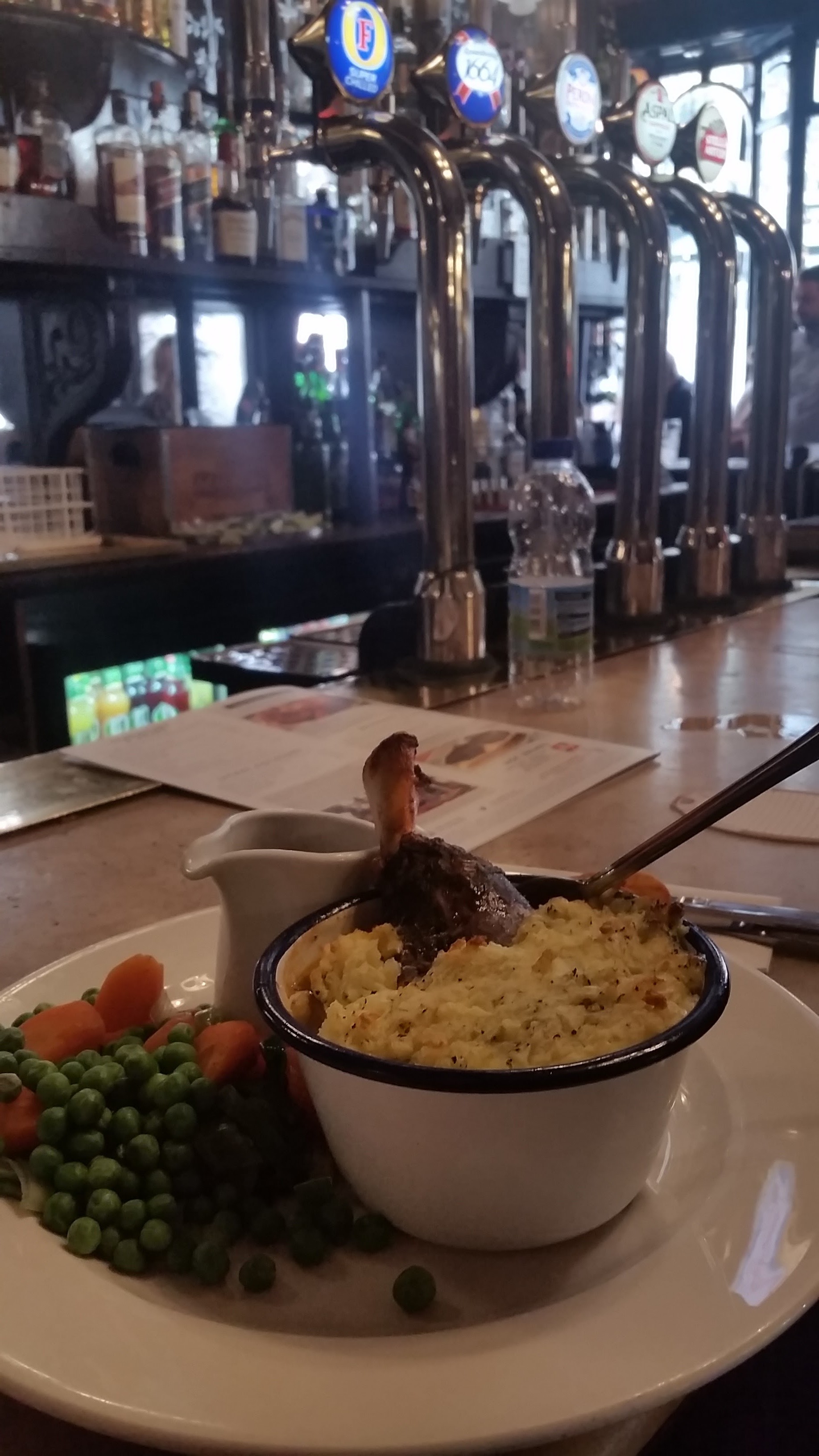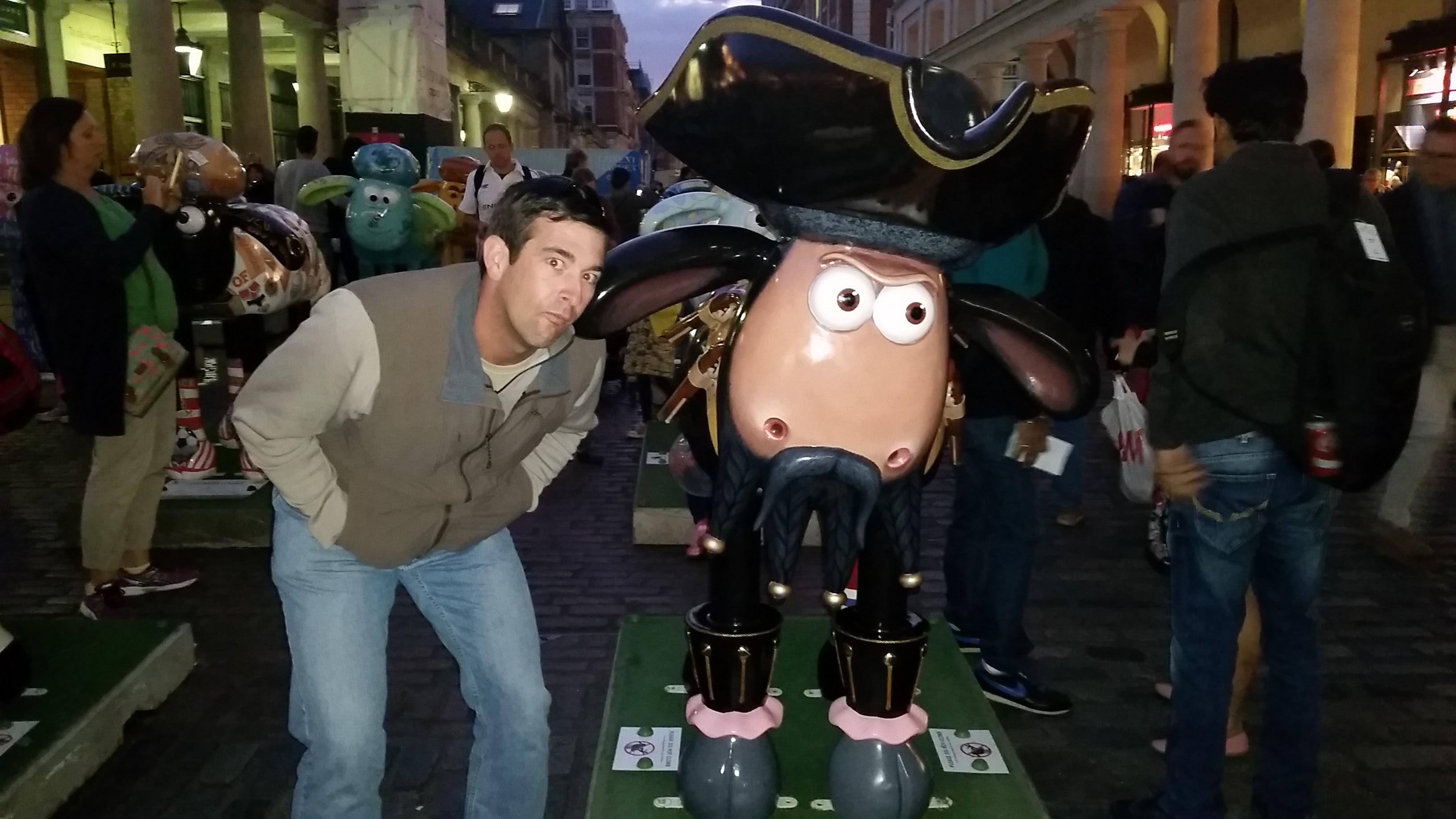 After the show, we walked back to a square that we had found on our way to get lunch. Covent Square had a few restaurants with balconies, and we decided to have a pint and watch the street performers.  After watching Master Yogi Laser walk on his hands with his legs over his arms and do crazy balancing acts on stilts in the air (in all my yoga-ness, I can do neither of these things), we decided to explore the large indoor/outdoor market area connected to the pub.  Decorations and sheep adorned everything. It was a special occasion for Shaun the Sheep (and raising money for the children’s hospital) and though we didn’t know the full meaning, we decided to take a few photo ops. We also stopped to have crepes in a little shop in the market, meandered some more, and then went to a traditional pub for dinner. I guess Jody was feeling more adventurous after being “recentered” by the burritos of Chipotle. We ate our last meal at the White Swan, where I enjoyed another meat pie, and then went back to the hotel. I met Jody for breakfast in the morning, and then said goodbye to my friend as he left to catch his flight home to the States. I stayed in very expensive London an extra day to catch up, plan and rest, but decided to catch a train to Paris the next day. At least Paris would be a little cheaper than London…(a little).